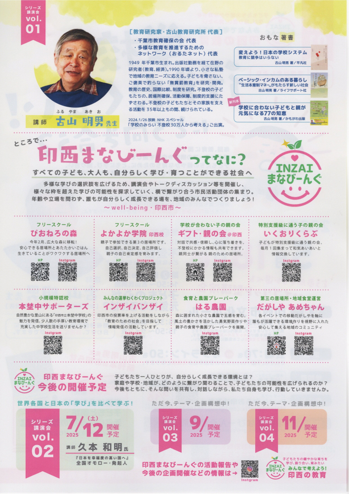 不登校の子どもに長年寄り添ってこられた古山明男氏による不登校事象の実態分析や、子どもの心理理解とその見識を慈愛に満ち溢れる、あたたかな講話から考えましょう。