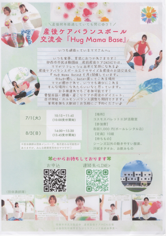 産後ケアバランスボールエクササイズ&産後のお話交流会「Hug Mama Base]を月1回開催しています。